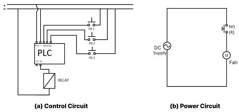 8. Once the ladder logic is verified, switch to the Power Circuit Section. Make the connections according to the Power Circuit diagram provided in Fig. (b).